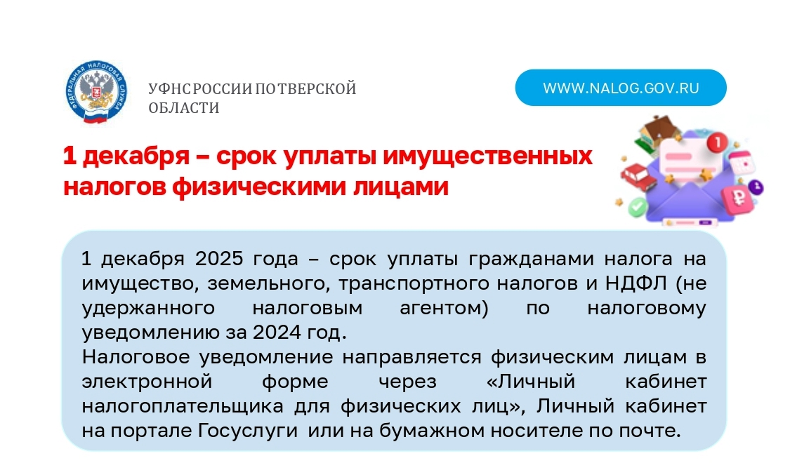 Стартовала рассылка налоговых уведомлений для уплаты физическими лицами транспортного и земельного налогов, налога на имущество, а также налога на доходы физических лиц (НДФЛ) с доходов, не удержанных налоговыми агентами, и с доходов по банковским вкладам.