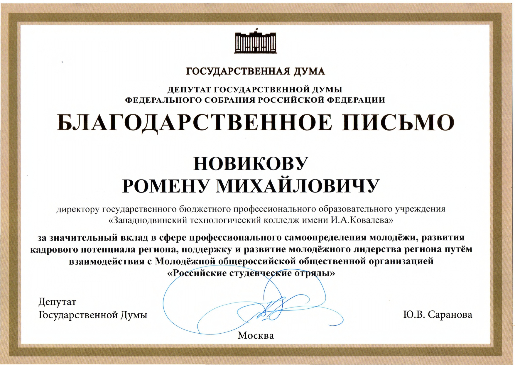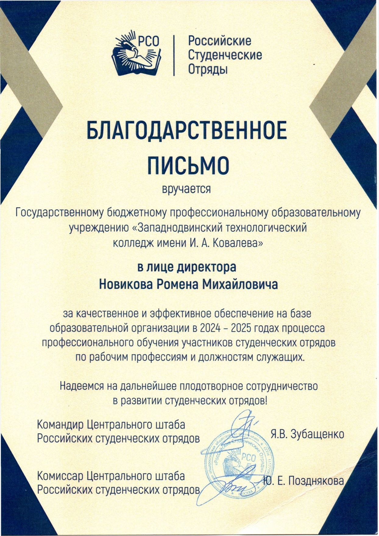 Благодарственное письмо РСО за качественное и эффективное обеспечение на базе образовательной организации в 2024-2025 г. процесса профессионального обучения участников студенческих отрядов по рабочим профессиям и должностям служащих в лице директора колледжа Новикова Р.М.